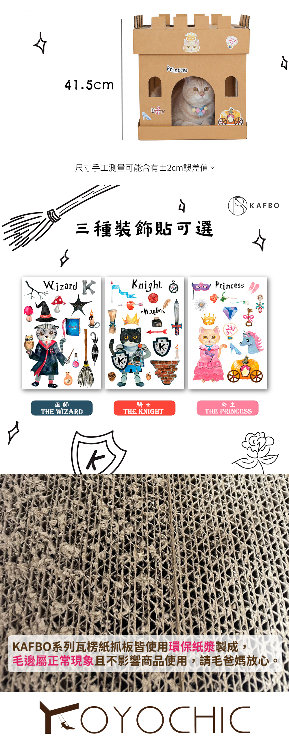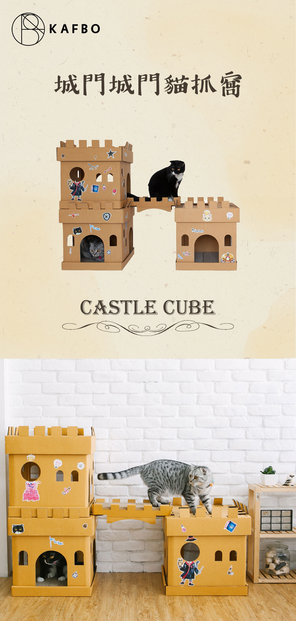 Castle Cube is a castle fort for your cats. You can stack up two or more castle forts to create a maze for your cats, where your cats can craw, jump, climb, and hide. Designed for DIY, the owner can put the provided stickers on the castle to give your special cats a spectacular home with unique decorations.