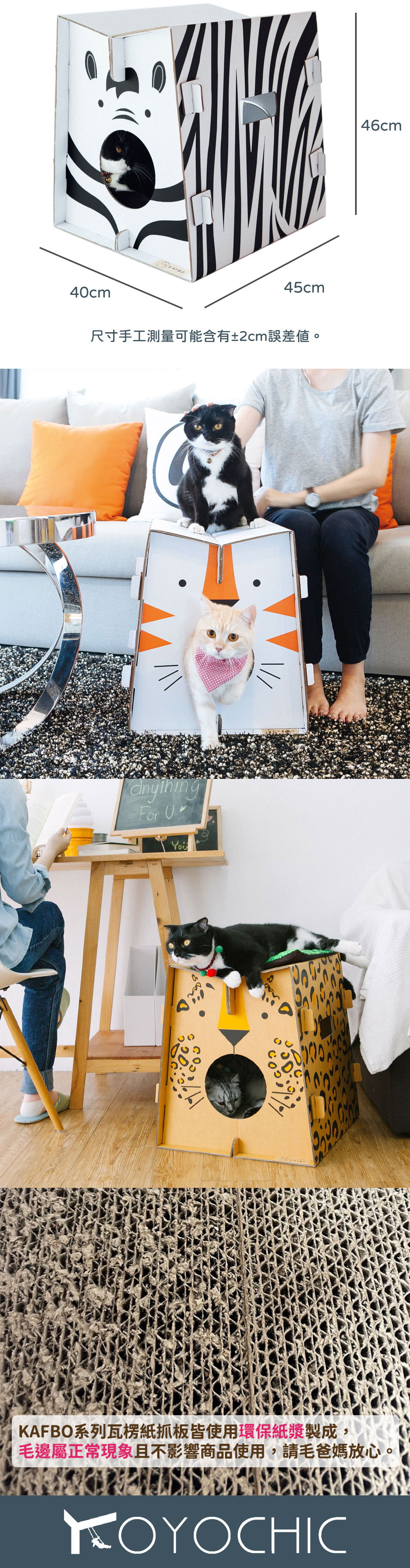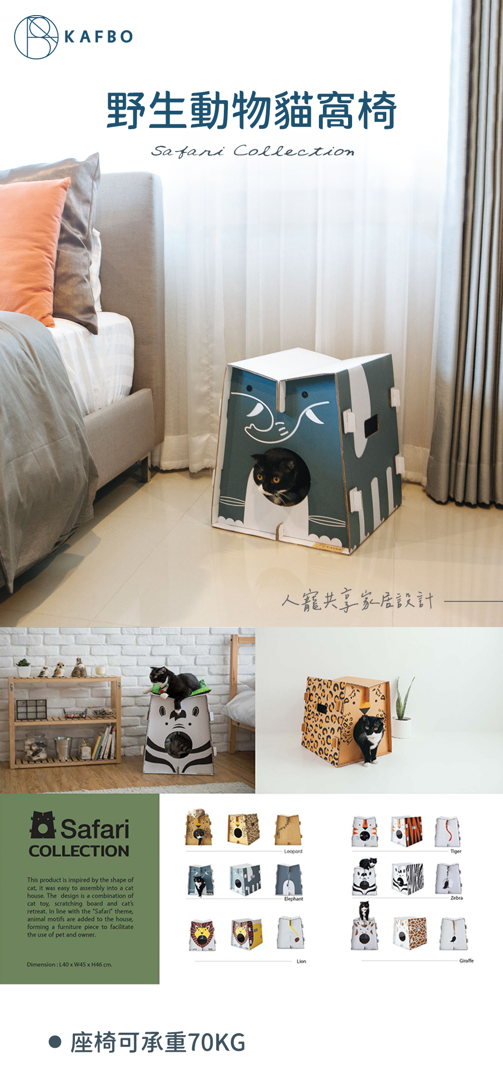 Cardboard boxes are most cats’ favourite toy, as they can play with them, climb on them, jump over them and hide in them. The box becomes a tiny fortress, giving your felines a sense of safety. This product design is inspired by the shape of a cat, from which lines are created and made into a house. It is a mixture of a toy, cat scratching board and retreat. In line with the “safari” theme, animal motifs are added to the box, forming a furniture piece for cats and humans in order to facilitate the use for both the pet and its owner. The box can also be your cute ornament. With the design for DIY, the pet owner also assembles the cat house for their pet.